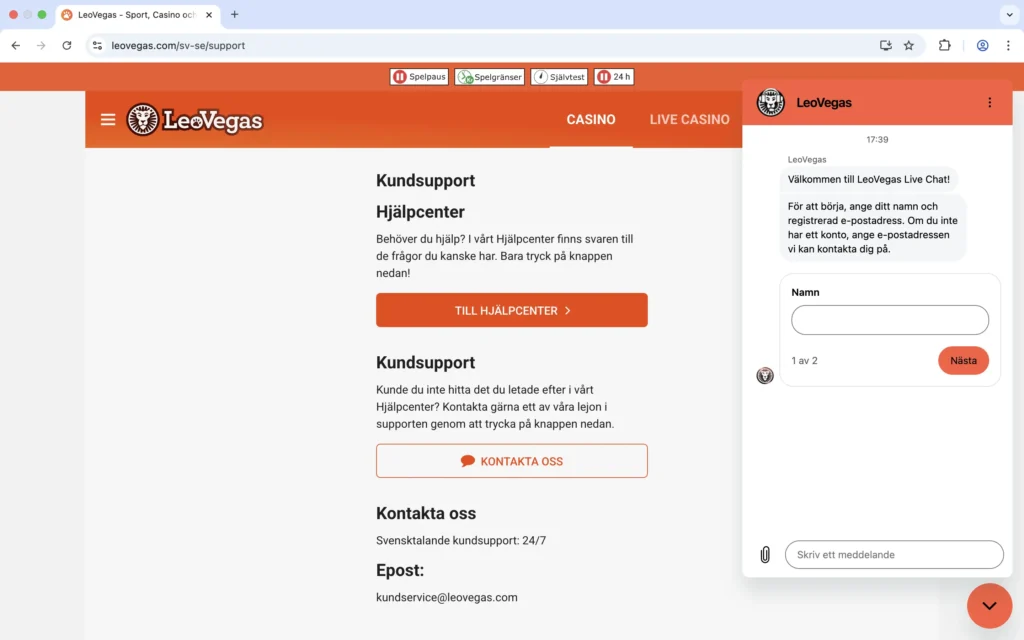 Livechatt: Ja – LeoVegas Kundtjänst